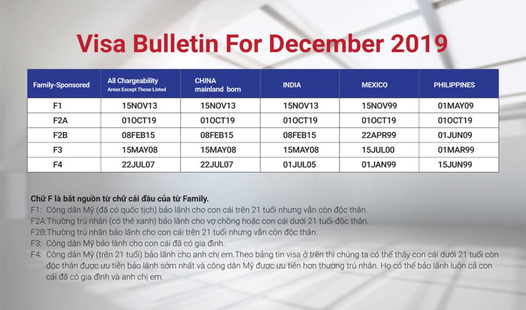 F4: Công dân Mỹ (trên 21 tuổi) bảo lãnh cho anh chị em.Theo bảng tin visa ở trên thì chúng ta có thể thấy con cái dưới 21 tuổi còn